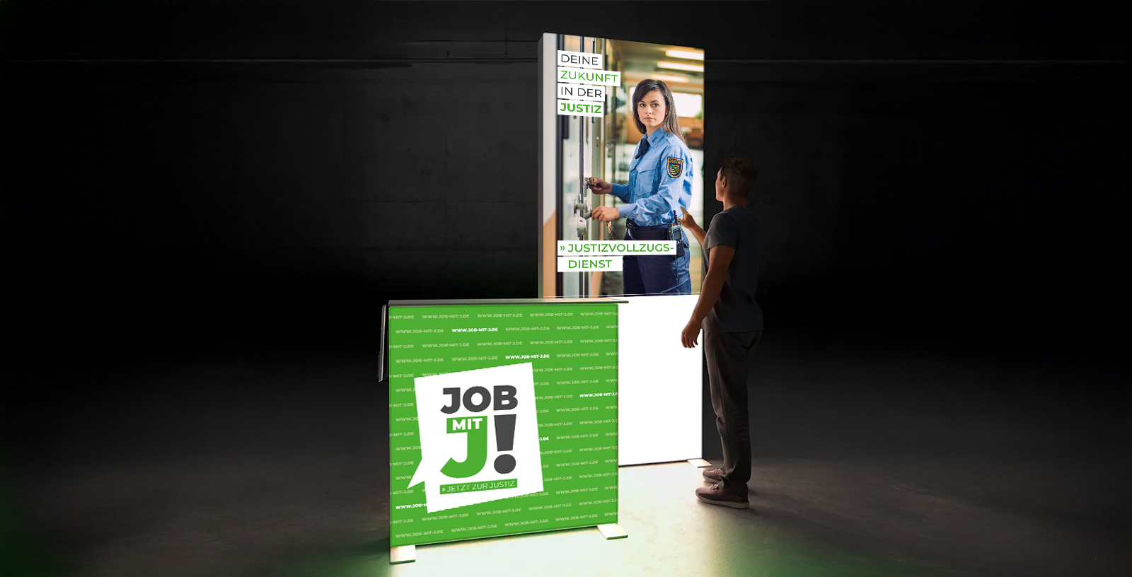 Für das Sächsische Staatsministerium der Justiz in Dresden haben wir einen Messestand entwickelt, der Branding und Design verbindet. Er wird auf einer Jobmesse eingesetzt, um über Karrierewege in der Justiz zu informieren und junge Bewerberinnen und Bewerber anzusprechen.